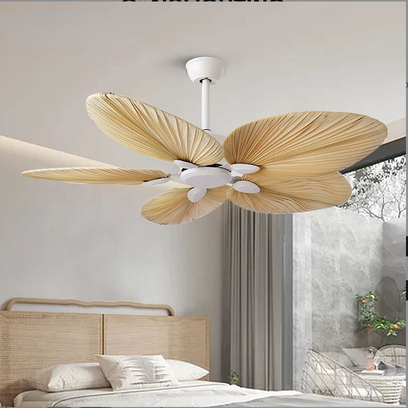 The Boho Sunflower Leaf Reversible Motor Ceiling Fan with Remote Control is an exquisite blend of bohemian charm and modern