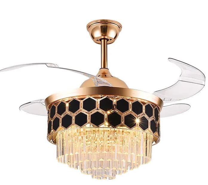 The Vanity Hive Inspired 6-Speed Ceiling Fan with Metal Body Crystal Chandelier is a striking combination of elegant design and